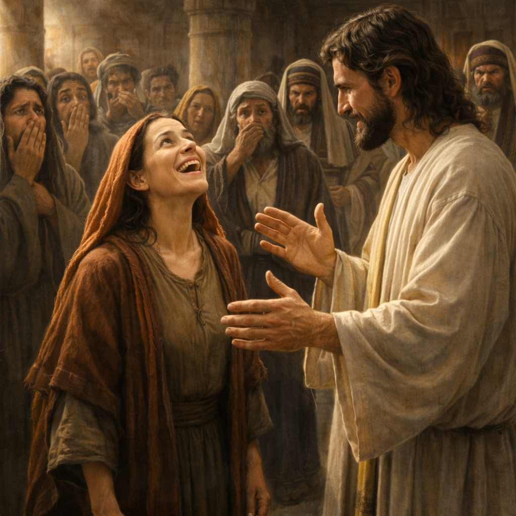On a Sabbath Jesus was teaching in one of the synagogues, and a woman was there who had been crippled by a spirit for eighteen years. She was bent over and could not straighten up at all. When Jesus saw her, he called her forward and said to her, “Woman, you are set free from your infirmity.” Then he put his hands on her, and immediately she straightened up and praised God.